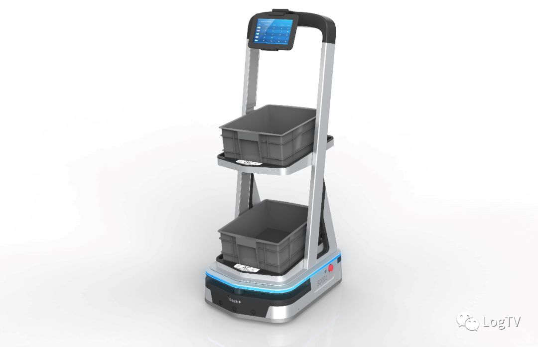 交互機器人底座依然是M100機器人,機器人上配備了兩層貨架,更像是一個跟隨機器人,可應用于揀貨場景。