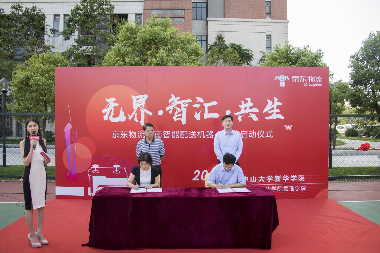 啟動儀式上,京東物流與中山大學新華院管理學院正式簽約成立了“智能物流無人配送車產學研基地”,京東大學華南分院院長劉曉蓉與中山大學新華學院管理學院執(zhí)行院長彭建平分別代表校企雙方簽約。