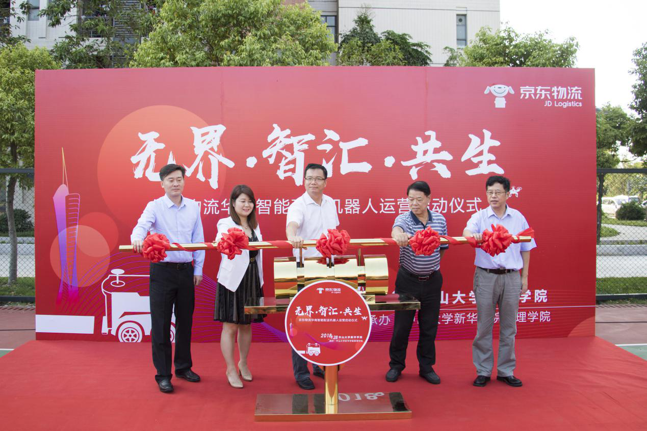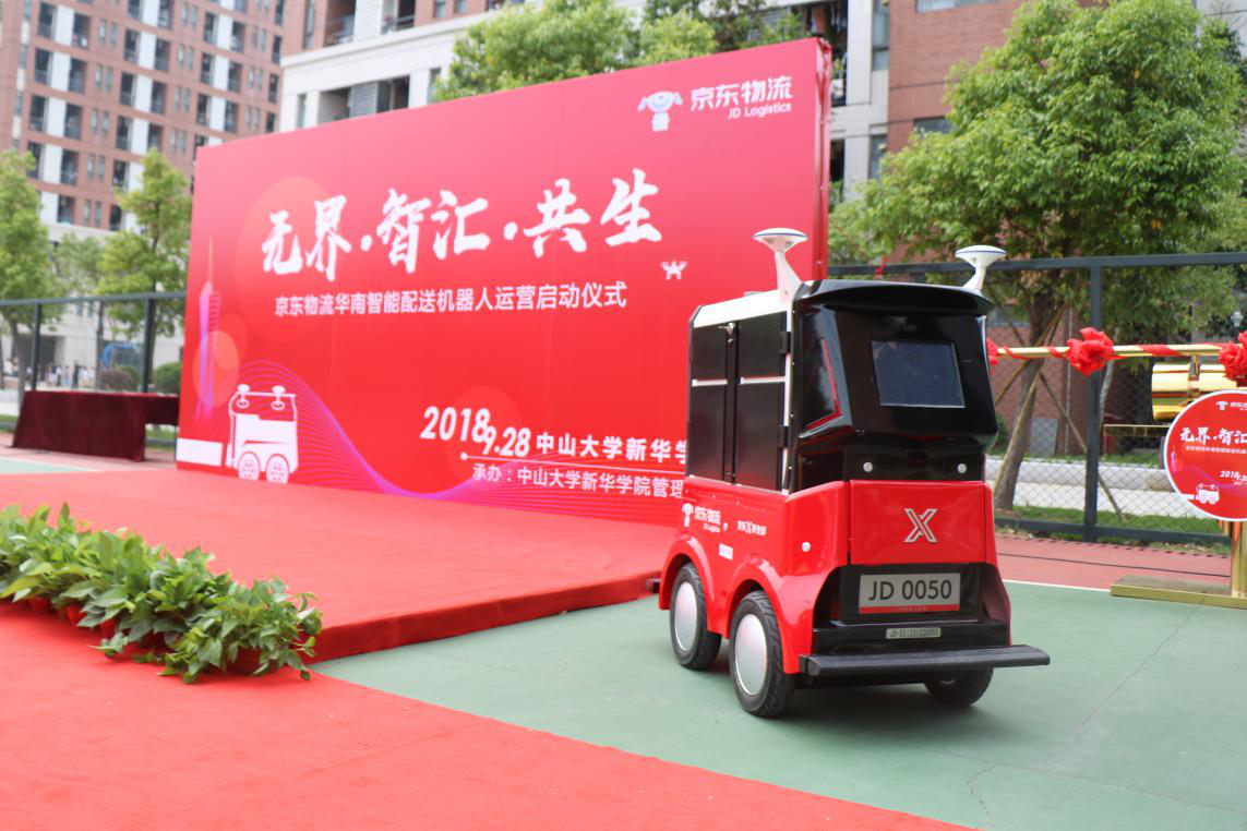 2018年9月28日下午,京東物流華南地區(qū)智能配送機器人啟動儀式在中山大學新華學院(以下簡稱中大新華)隆重舉行。廣東省郵政管理局副局長羅德韶、市場監(jiān)管處處長鄔亦斌,東莞市郵政管理局局長林蔚,京東物流華南分公司規(guī)劃實施部總經理王宇、市場部總經理蘇艷萍、公共事務高級總監(jiān)兼黨委書記柯嘉妮、京東大學華南分院院長劉曉蓉,中山大學新華學院副校長李中生、管理學院執(zhí)行院長彭建平、教務處處長尹小川等領導出席啟動儀式,中大新華百余名師生以及30多家媒體見證了此次盛會。