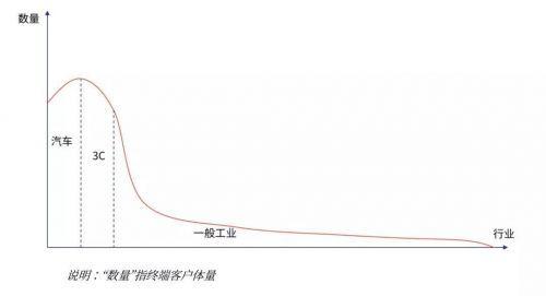 其次,從市場角度,中國國內市場特征也和其他國家有較大不同。汽車產業(yè)作為工業(yè)機器人最先規(guī)?;褂玫念^部市場,對機器人本體和集成要求都較高,一直以來均被國外“四大家”所占據(jù)。目前中國工業(yè)機器人在汽車產業(yè)雖然也有少量應用,但畢竟是極小部分非主流應用;同時國內汽車市場的機器人滲透率已經很高,雖然整體市場規(guī)模較大,但增量有限,因此中國國內工業(yè)機器人市場在較長一段時間內,均會呈現(xiàn)出較為明顯的“長尾特征”,除3C等快速崛起市場占據(jù)一定份額外,其他應用市場均存在客戶規(guī)模小、資金實力差、應用水平低、地理分布極其分散、整體數(shù)量巨大等特點。以往此類“長尾市場”(如圖1)幾乎不可能成為傳統(tǒng)工業(yè)機器人行業(yè)的客戶,由于資金實力差,之前“四大家”機器人高企的價格完全超出其可承受范圍;由于自身應用水平低,而本體廠商并不提供一站式服務,所以對集成商依賴度高;由于部署規(guī)模小,對于集成商而言屬于“雞肋”,食之無味,棄之可惜。但隨著近年來中國本土機器人本體和零部件廠商的崛起,價格快速下降,標準化工藝應用大幅降低應用門檻和對集成商依賴,以上提到的這些問題在短短兩年內得到一定程度解決,從而使得中國工業(yè)機器人市場呈現(xiàn)出快速爆發(fā)性成長的態(tài)勢。
