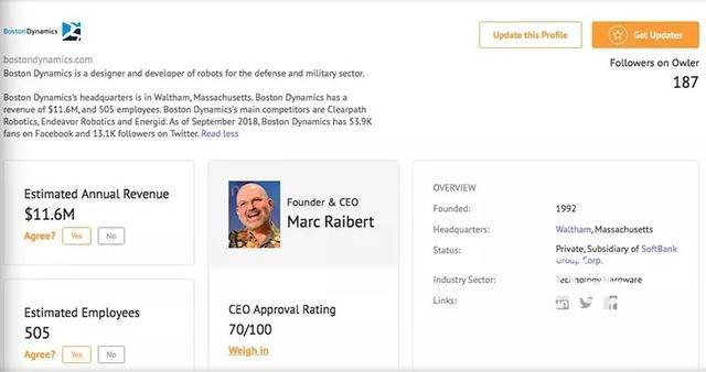 不過,據(jù)Owler網(wǎng)站顯示,波士頓動力的預(yù)估年收入在116萬美元,預(yù)估的人員規(guī)模有505人。