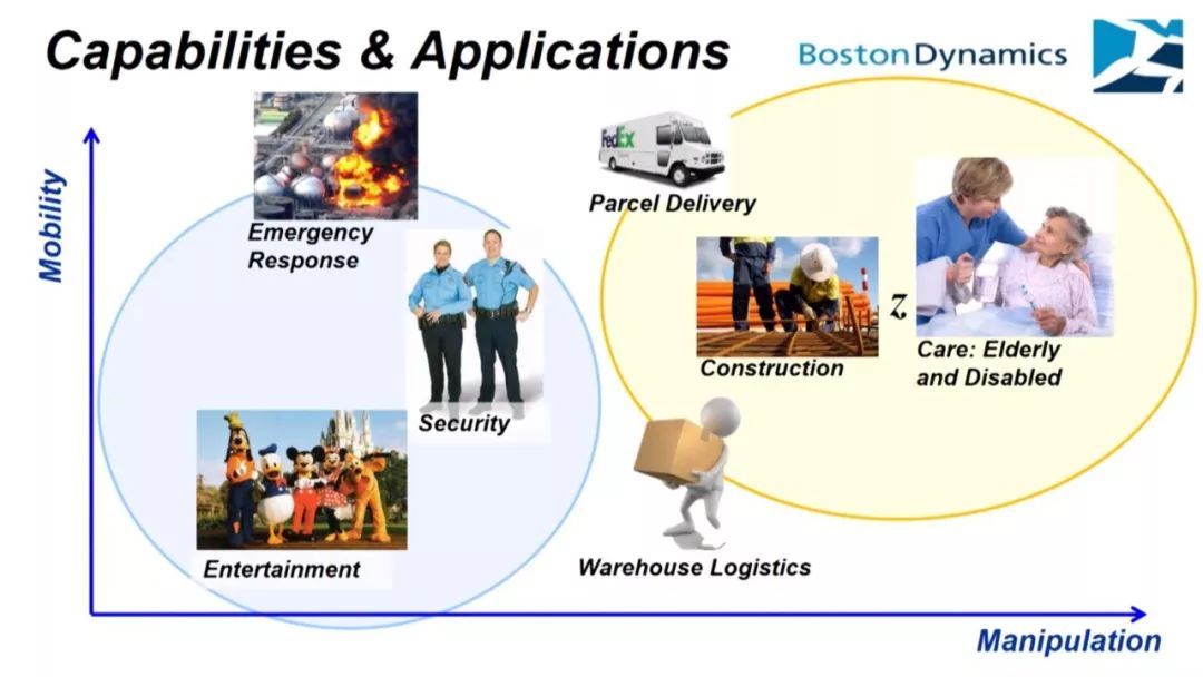 圖 | 左側(cè)藍(lán)圈是波士頓動力眼下正在研發(fā)的應(yīng)用,右側(cè)黃圈是公司對更高級應(yīng)用的遠(yuǎn)期規(guī)劃。(來源:波士頓動力)