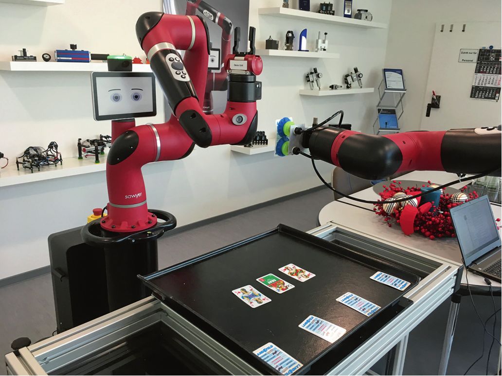 一般情況下 Rethink 機器人公司研發(fā)生產(chǎn)的機器人 Sawyer 會承擔(dān)工業(yè)生產(chǎn)環(huán)境中的工作以減輕員工的工作負擔(dān)。迄今為止還沒有在存儲器生產(chǎn)過程中使用過 Sawyer 機器人。機器人在存儲器應(yīng)用中的挑戰(zhàn)是兩臺機器人之間要保持暢通無阻的信息交互,因此第一臺機器人的真空吸盤機械手都要拿起五個存儲器芯片中的一個,而拾取芯片的位置是事前作為參考點輸入進去的 ;第二臺機器人則用內(nèi)置的攝像機掃描著被吸取的芯片,所有芯片的位置都事先‘學(xué)習(xí)’過并與不同的加工指令聯(lián)系在一起。根據(jù)紙牌與芯片的情況,Sawyer 2 會在設(shè)定的地方觸發(fā)第一臺機器人,憑借強制性的感應(yīng) - 掃描功能,兩臺機器人就能夠精確地確定相互接觸的物質(zhì),并準(zhǔn)確地執(zhí)行該接觸點提供的工作指令,即將芯片放置到紙牌片規(guī)定的物質(zhì)上,這些指令鏈會重復(fù)多次,直到最后紙牌片制作完成為止,最后再驗證一下是否五個存儲芯片都在規(guī)定的位置上。