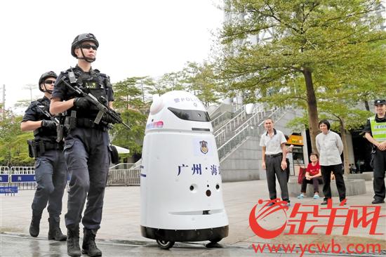 出更首日,它與羊城突擊隊海珠分隊的隊員們在廣州塔景區(qū)執(zhí)勤,許多市民紛紛和這名機器人“警官”合影。