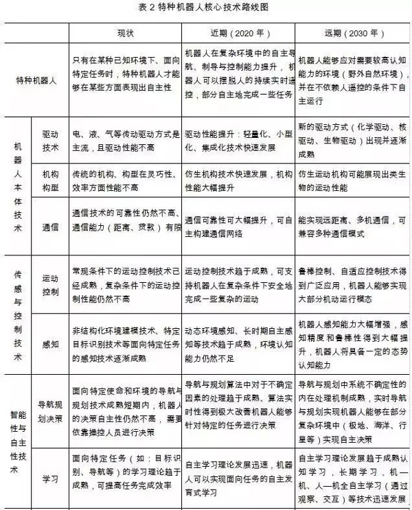發(fā)展具有自主知識產(chǎn)權(quán)的海洋探測技術(shù),研發(fā)面向資源勘探、捕撈救援、環(huán)境監(jiān)測等需求的系列化海洋裝備,推動(dòng)產(chǎn)業(yè)化進(jìn)程,提供我國在深遠(yuǎn)海國際競爭中的技術(shù)支撐與能力保障;研發(fā)國防建設(shè)急需的無人化機(jī)器人裝備,包括面向海陸空單一環(huán)境和多棲環(huán)境的無人偵查及作戰(zhàn)機(jī)器人系統(tǒng)、增強(qiáng)單兵能力的助力機(jī)器人、智能光電系統(tǒng)等;研發(fā)面向極地科考、核電站巡檢、空間科學(xué)實(shí)驗(yàn)等需求的特種機(jī)器人系統(tǒng),其核心技術(shù)路線圖如表 2 所示。