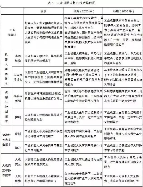 面向新工業(yè)革命的需求,研發(fā)下一代工業(yè)機(jī)器人及機(jī)器人操作系統(tǒng),在柔順機(jī)電設(shè)計(jì)技術(shù)、非結(jié)構(gòu)環(huán)境理解、實(shí)時(shí)認(rèn)知技術(shù)、人機(jī)協(xié)同任務(wù)規(guī)劃技術(shù)、自適應(yīng)與可重構(gòu)裝配技術(shù)、安全性技術(shù)等方面進(jìn)行技術(shù)變革,通過大數(shù)據(jù)、云計(jì)算為代表的信息技術(shù)與機(jī)器人技術(shù)的融合,促進(jìn)機(jī)器人綜合能力的提升,實(shí)現(xiàn)與人的緊密協(xié)作,提升制造系統(tǒng)的智能化, 滿足新工業(yè)革命對個(gè)性化制造模式的要求,其核心技術(shù)路線圖如表 1 所示。