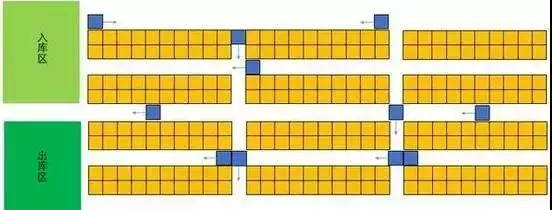 不同的貨架擺放方式也會直接影響到揀選機器人的效率,本文使用下圖所示的擺放方式進行設(shè)計。該方法對于其他路網(wǎng)模型的兼容性較高,研究成果擴展性較強,同時該模型可以最大化倉儲空間,也是物流車輛和倉儲快速對接的一種最大化空間利用模型。