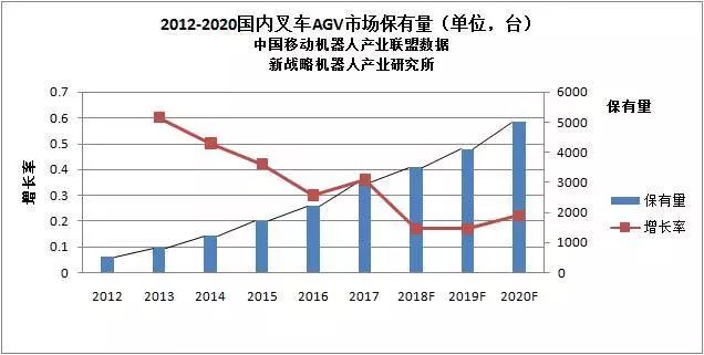 從未來(lái)發(fā)展趨勢(shì)來(lái)看,AGV的銷量還將保持穩(wěn)步增長(zhǎng)的趨勢(shì)。下圖是新戰(zhàn)略機(jī)器人關(guān)于無(wú)人叉車未來(lái)增長(zhǎng)數(shù)據(jù)的預(yù)測(cè),預(yù)計(jì)到2020年AGV叉車的銷量將突破5000臺(tái),迎來(lái)歷史新高。