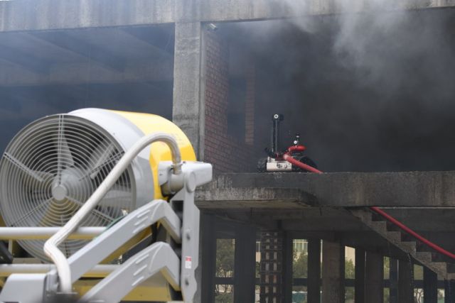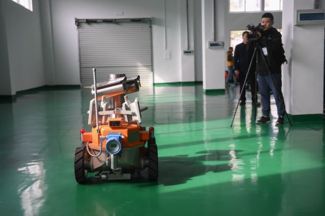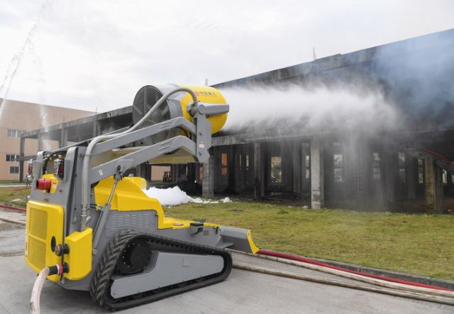 消防排煙滅火機(jī)器人在進(jìn)行排煙滅火演示。