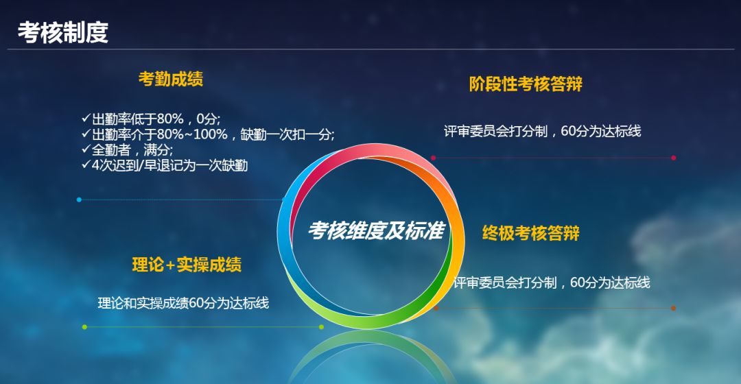 第二,魔鬼式訓(xùn)練,嚴(yán)苛淘汰率。云梯計劃的淘汰率極高,無論是課程編排,還是比賽機(jī)制都是極其嚴(yán)苛的,學(xué)員需要在高強(qiáng)度的學(xué)習(xí)環(huán)境下完成每一次考核和操作,堪稱“魔鬼式的訓(xùn)練” 。與此同時,云梯計劃的門檻極高。6次考試或答辯成績不達(dá)標(biāo)即為肄業(yè),不頒發(fā)畢業(yè)證,綜合成績60分以下,排名后20%-30%的淘汰率,不頒發(fā)畢業(yè)證。