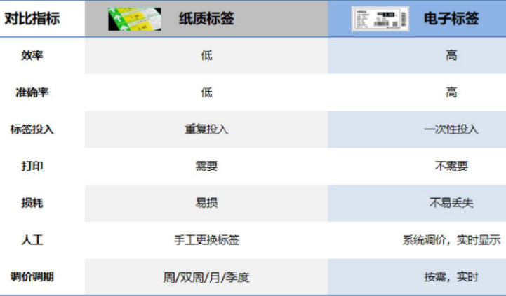 紙標(biāo)簽有著較高的局限性無(wú)法實(shí)時(shí)顯示后端的商品價(jià)格聯(lián)動(dòng)庫(kù)存,更換排面時(shí)調(diào)整標(biāo)簽的工作量較大,執(zhí)行性差,且準(zhǔn)確性無(wú)法得到保證。電子標(biāo)簽擺脫了手動(dòng)更換價(jià)格標(biāo)簽的狀況,實(shí)現(xiàn)了后端數(shù)據(jù)庫(kù)、收銀臺(tái)、商品之間的價(jià)格一致性、實(shí)時(shí)性,節(jié)省了人力開支,無(wú)紙化作業(yè),提高整理管理效率,避免了人為的標(biāo)識(shí)錯(cuò)誤價(jià)格造成的損失。