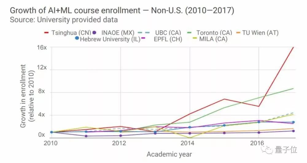 縱向?qū)Ρ葋砜?,清華2017年AI+ML課程注冊人數(shù)是2010年的16倍。