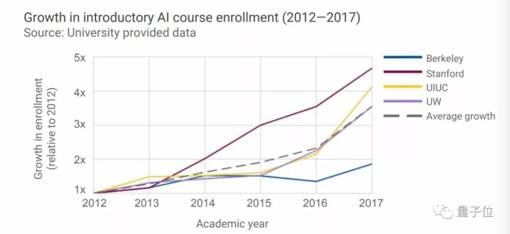 報告顯示,截止到2017年底,AI課程注冊人數(shù)是2012年的3.4倍,ML課程注冊人數(shù)是2012年的5倍。