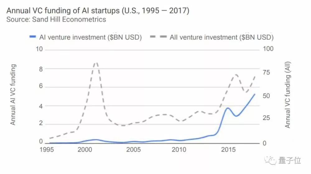 在風投資金方面,從2013年到2017年,人工智能領域的風投資金增長到了原來的4.5倍,而所有的風投資金只增長到了原來的2.08倍。這些數(shù)據(jù)都是年度數(shù)據(jù),不是逐年累積的。