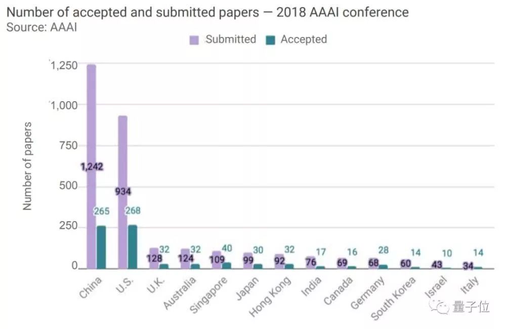 70%的AAAI論文來自美國或中國,兩國獲接收的論文數(shù)量相近,但中國提交的論文總量比美國多30%。