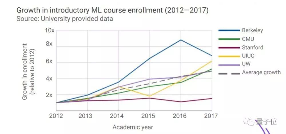 其中,UC伯克利的ML課程的注冊人數(shù)增長最快,是2012年的6.8倍,但此數(shù)值較2016年增長速度有明顯下降。
