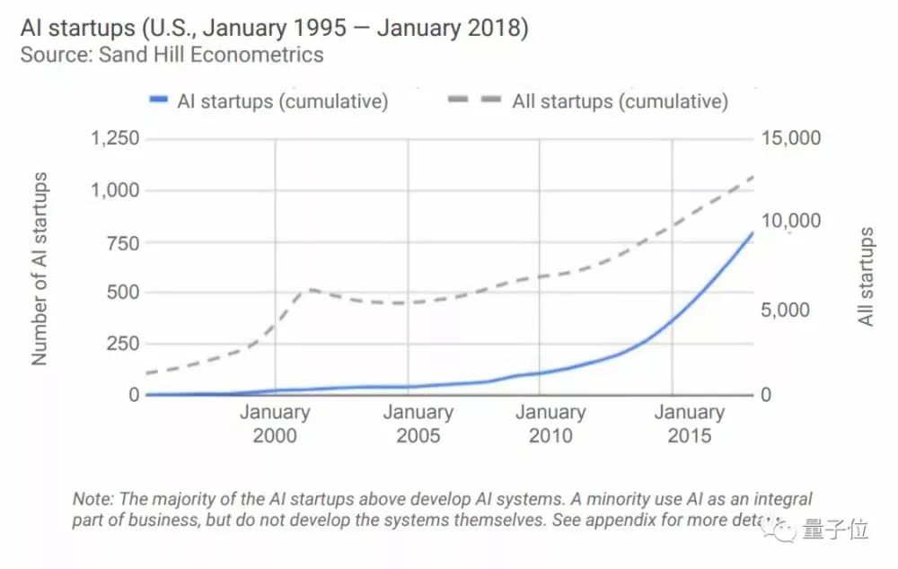 從2015年1月到2018年1月,人工智能創(chuàng)業(yè)公司的數(shù)量增長到了原來的2.1倍,而所有活躍的創(chuàng)業(yè)公司增長到了原來的1.3倍。