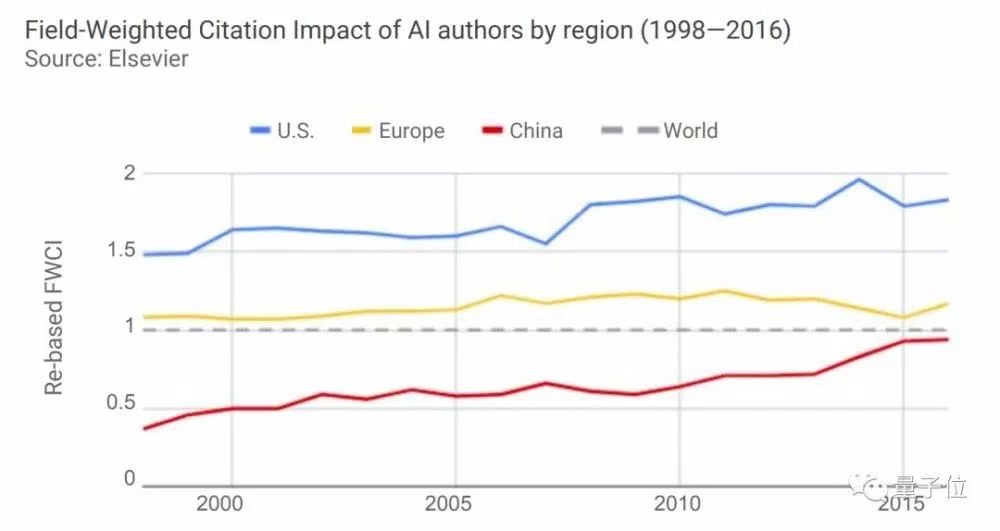 不過在這方面,美國依然全球領先,美國AI論文作者的平均引用率,比世界平均值高出83%。