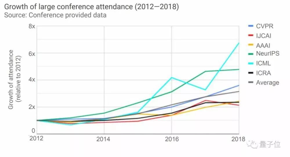 在大型會議中,NeurIPS (曾用名NIPS) 、CVPR和ICML,是參與人數(shù)最多的三大AI會議。自2012年以來,論參與人數(shù)的增長率,這三者也領先于其他會議。