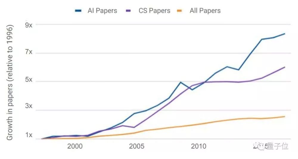 從1996年到2017年,CS領域的年發(fā)表論文增長了約五倍 (6x) ,AI領域的年發(fā)表論文增長了約七倍 (8x) 。對比一下,所有學科的年發(fā)表論文總量增長了不到兩倍 (