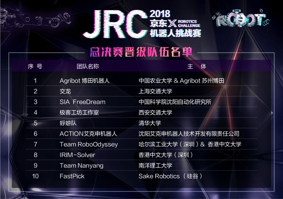 ▲2018京東X機(jī)器人挑戰(zhàn)賽總決賽晉級(jí)隊(duì)伍名單