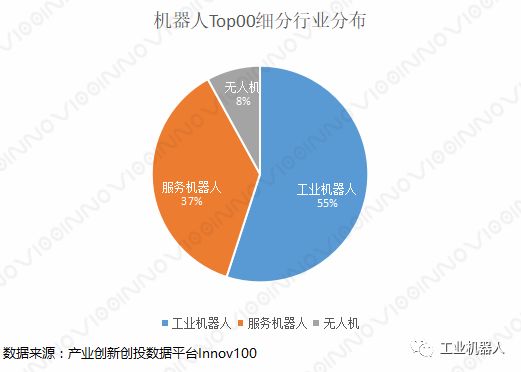 機(jī)器人創(chuàng)新Top100中,工業(yè)機(jī)器人的公司占比最高,達(dá)到55家,占比55%,服務(wù)機(jī)器人37家,無(wú)人機(jī)為8家緊隨其后。