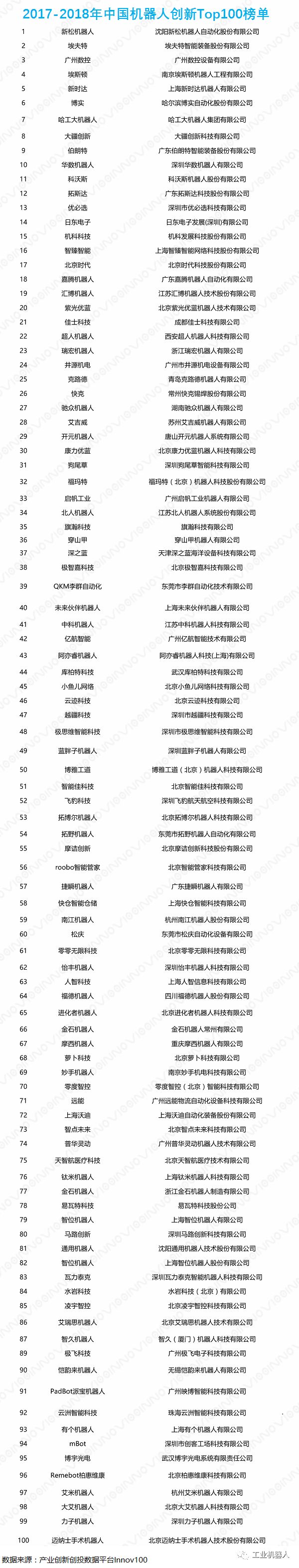 一、2017-2018年中國(guó)機(jī)器人創(chuàng)新Top100榜單