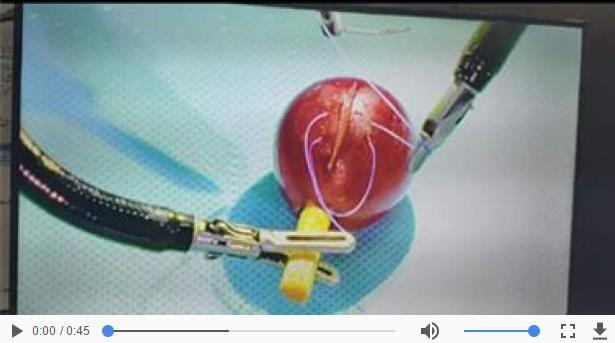 上方視頻里的機(jī)器人,是上海交大機(jī)械與動(dòng)力工程學(xué)院、醫(yī)療機(jī)器人研究院教授徐凱研發(fā)的單孔腔鏡手術(shù)機(jī)器人,主要由兩個(gè)部分組成,醫(yī)生操縱主控端中兩臺(tái)力交互輸入設(shè)備,在立體三維視覺的引導(dǎo)下,對(duì)從動(dòng)端病患側(cè)手術(shù)執(zhí)行系統(tǒng)內(nèi)的三支手術(shù)執(zhí)行臂和一支視覺引導(dǎo)臂實(shí)施遙操作,實(shí)現(xiàn)手術(shù)視野調(diào)整,亦實(shí)現(xiàn)組織剝離、電切、電凝、縫合等一系列腔內(nèi)精準(zhǔn)操作,完成多種適應(yīng)癥的手術(shù)治療。