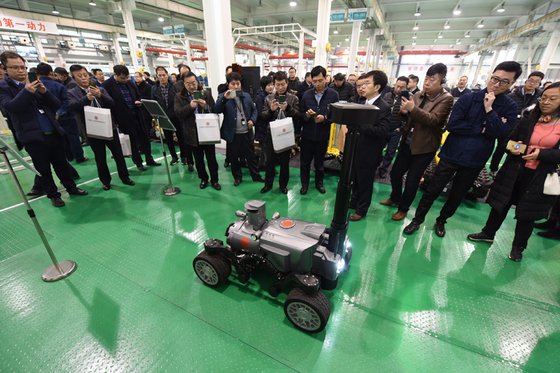 12月22日,人們在參觀拍攝一款防爆輪式巡檢機(jī)器人。