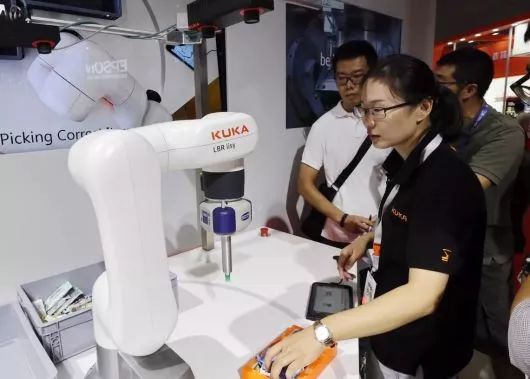 在第二十屆中國(guó)國(guó)際工業(yè)博覽會(huì)上,KUKA新款靈敏輕型機(jī)器人LBR iisy在亞洲首次展示。全新的LBR iisy通過(guò)平板電腦輕松設(shè)置操作,就可實(shí)現(xiàn)“即插即用”,是一款真正靈敏協(xié)作的機(jī)器人。LBR iisy在生產(chǎn)制作過(guò)程可復(fù)制人員控制、監(jiān)控生產(chǎn)等勞累的體力工作。更重要是,它還達(dá)到不隔開、無(wú)護(hù)欄的人機(jī)協(xié)同合作的最佳理想狀態(tài)。