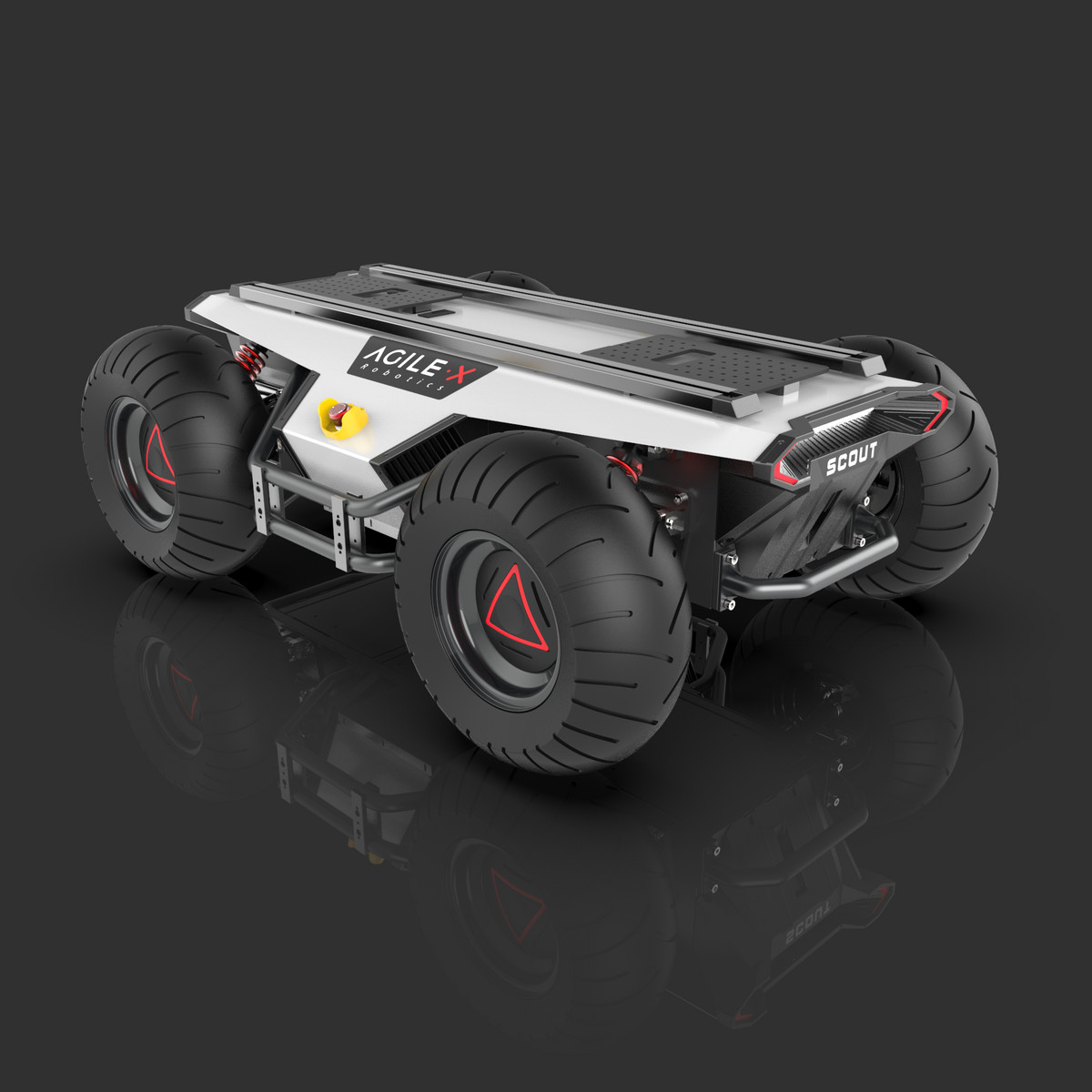 SCOUT為主力產品,長約一米,寬約70厘米,可進入普通電梯間或放置在后備箱中,保證快速現(xiàn)場投放;同時,在該尺寸下采用四輪驅動,每個輪配置獨立的200瓦無刷伺服電機作為動力,采用雙橫臂獨立懸架,可選配公路、草地、泥地3種輪胎外形,保證動力的同時提高了車體對地形的適應性,可翻越10cm的障礙物,保證戶外場景的可用性。
