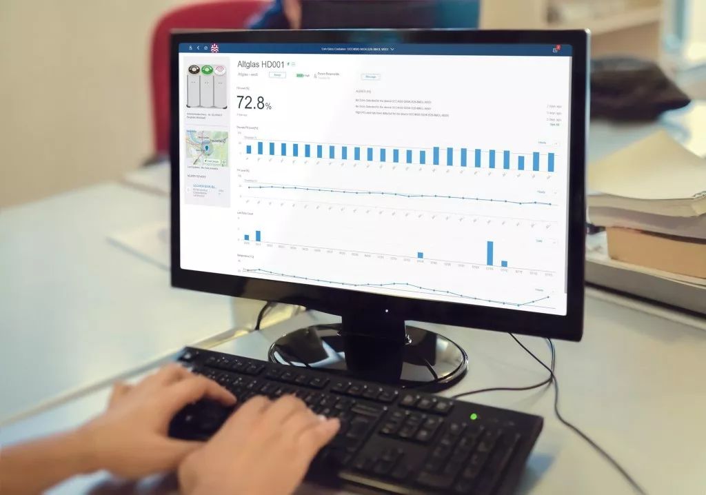 用戶顯示屏顯示結(jié)構(gòu)清晰的儀表板界面。 Rambo描述了它的功能:“一旦容器被投入使用,SAP 平臺(tái)就會(huì)以百分比的形式顯示容器中的料位,GPS數(shù)據(jù)可以讓我們?cè)诘貓D上查看各個(gè)容器的確切位置。通過整合技術(shù)進(jìn)入我們的SAP廢棄物和回收行業(yè)解決方案,我們可以定義規(guī)則來管理玻璃回收容器何時(shí)被認(rèn)為已裝滿,并且可以自動(dòng)安排廢棄物管理人員迅速清空容器。這意味著廢棄物收集車輛的路線,將根據(jù)當(dāng)前動(dòng)態(tài)需求而定。”