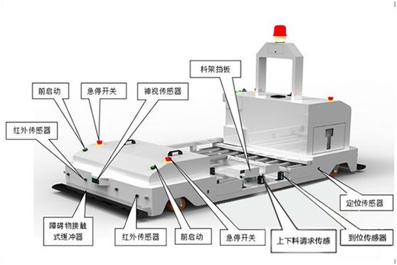 信號(hào)燈:AGV安裝有醒目的信號(hào)燈和電子音樂(lè)播放器,以提醒周圍的操作人員避讓。