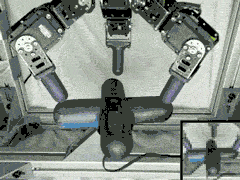 下面這個(gè)操控任務(wù)需要機(jī)械手轉(zhuǎn)動(dòng)一個(gè)類似閥門的物體,目標(biāo)是讓藍(lán)色的一面朝向右側(cè)。這個(gè)任務(wù)尤其有挑戰(zhàn)性,不僅任務(wù)的理解感知有難度,而且還需要控制這個(gè)具有 9 個(gè)自由度的機(jī)械手。為了能夠感知這個(gè)閥門,機(jī)器人必須要使用來自攝像頭的原始 RGB 圖像輸入(如圖右下角)。對(duì)于每一輪嘗試,閥門的位置都會(huì)重新設(shè)定到一個(gè)隨機(jī)角度,迫使策略學(xué)習(xí)如何根據(jù) RGB 圖像輸入感知當(dāng)前的閥門角度。