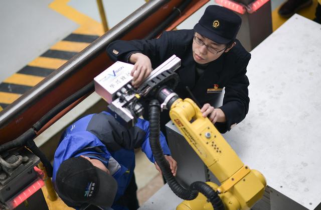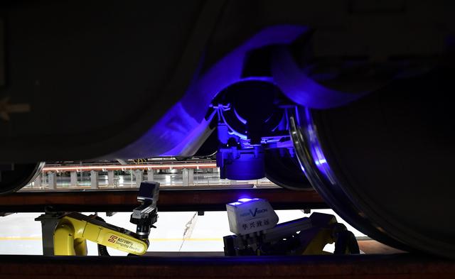 新華社照片,成都,2019年1月24日 機(jī)器人“檢”動(dòng)車(chē) 1月24日,在中國(guó)鐵路成都局集團(tuán)有限公司成都動(dòng)車(chē)段,工作人員和動(dòng)車(chē)智能檢測(cè)機(jī)器人一同對(duì)動(dòng)車(chē)進(jìn)行檢修。 春運(yùn)期間,中國(guó)鐵路成都局...