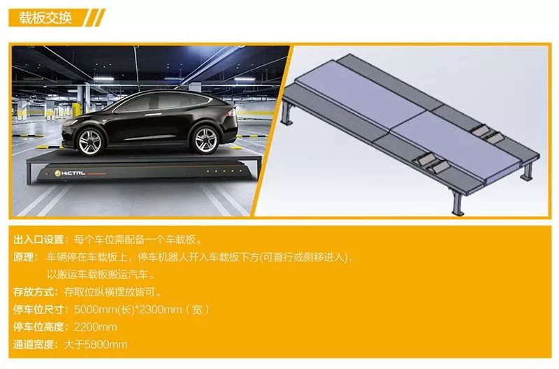匯聚OMV停車機器人采用車載板、梳齒架交換等工裝,車輛停在車載板上,停車機器人開入車載板下方(可直行或側移進入),以搬運車載板及汽車停到指定車位,停車位尺寸:長5米,寬2.3米,高2.2米,通道寬度大于5.8米,對于停放SUV等高頂車都能適用。