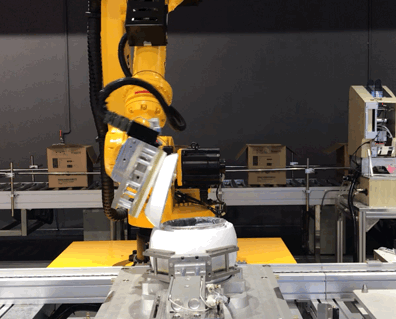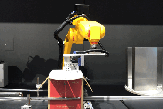 介紹:擁有視覺識別功能的7號機器人迅速出動,能快速定位包裝線上的箱子,并動態(tài)跟蹤箱子的移動位置,接著將飯勺放在上層泡沫的指定孔位,完成最后一個附件的裝箱。