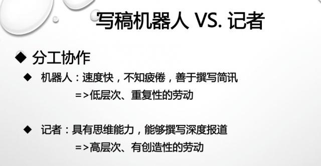 目前為止,機(jī)器人跟記者之間的關(guān)系是一種分工協(xié)作的關(guān)系。機(jī)器人現(xiàn)在不具有邏輯思維的能力,也不具備深度總結(jié)的能力,機(jī)器人只能把一個(gè)基本的新聞事實(shí)描述清楚,但是記者就可以寫(xiě)深度報(bào)道,比如說(shuō)中國(guó)足球,記者可以經(jīng)過(guò)自己的分析,寫(xiě)中國(guó)足球這幾十年來(lái)落后的原因,也可以總結(jié)出幾條觀點(diǎn),但是機(jī)器人就很難實(shí)現(xiàn)這樣的能力。所以記者應(yīng)該是從事有創(chuàng)造性的、高智商的稿件的創(chuàng)作,而把一些重復(fù)的、低層次的稿件創(chuàng)作的活動(dòng)交給機(jī)器人完成,即記者和機(jī)器人是一種分工協(xié)作的關(guān)系。