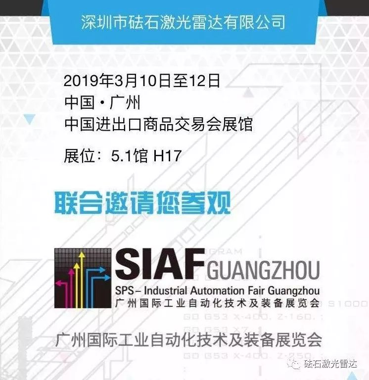 屆時,砝石激光雷達將攜蜂眼系列的新品F系列激光雷達?和S系列激光雷達亮相于SIAF 2019廣州國際工業(yè)自動化技術展會A區(qū)5.1館H17展位,現(xiàn)誠邀您蒞臨參觀。