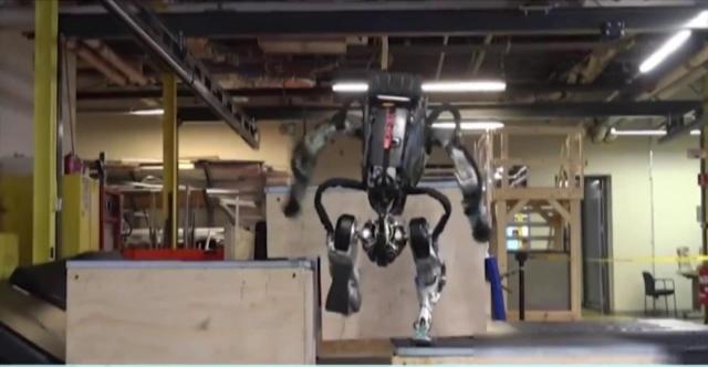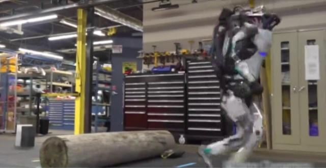 我們來仔細看一下這個視頻,在視頻的開始,Atlsa一抽一抽地小跑來到了一根圓木前,注意,它連停都沒停,直接單腳跳過這根圓木,然后用小沈陽式的步伐來到三個錯位高臺,也是面不改色心不跳地直接單腳跳上去,跳躍高度達40厘米,來從另一個角度看一下。
