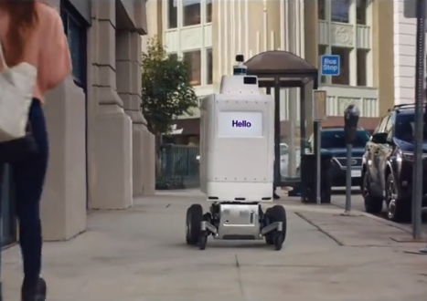 該機(jī)器人的宣傳視頻還顯示,它的前后都將配有屏幕,以便與行人交流。前方屏幕會(huì)顯示“hello”,后方屏幕則會(huì)顯示行駛方向,以及是否即將停下。無人駕駛汽車也在測試類似的技術(shù),希望借此減少事故,避免人類與機(jī)器之間產(chǎn)生誤解。