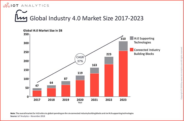 據(jù)IoT Analytics在2018年11月的預(yù)測(cè),2018年IIoT市場(chǎng)規(guī)模為640億美元,到2023年,該市場(chǎng)將增長(zhǎng)到3100億美元,復(fù)合增長(zhǎng)率為37%。