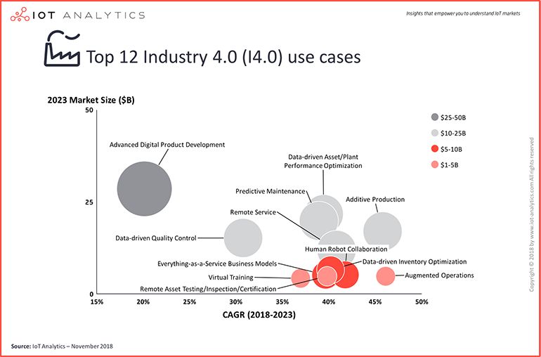 其中,在IoT Analytics劃出的12個(gè)應(yīng)用場(chǎng)景中,高級(jí)數(shù)字產(chǎn)品開發(fā)將成為市場(chǎng)規(guī)模最大的應(yīng)用場(chǎng)景,而2018年和2023年之間增長(zhǎng)最快的將是增材制造(即工業(yè)規(guī)模3D打?。┖驮鰪?qiáng)操作。