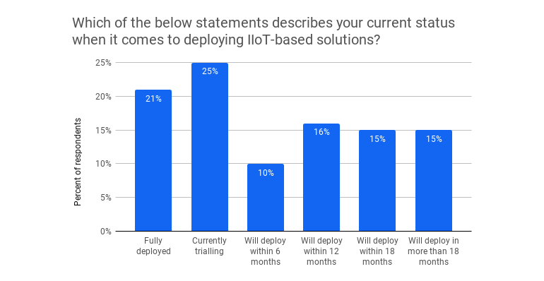 該項(xiàng)研究采訪了來(lái)自多家機(jī)構(gòu)的750名受訪者。據(jù)調(diào)查數(shù)據(jù),近一半(46%)的企業(yè)已經(jīng)部署了IIoT解決方案,其中完全部署的達(dá)到21%,處于試用階段的達(dá)到25%。部署IIoT的主要驅(qū)動(dòng)因素是資源效率,健康和安全的改善,以及對(duì)環(huán)境變化的監(jiān)測(cè)。
