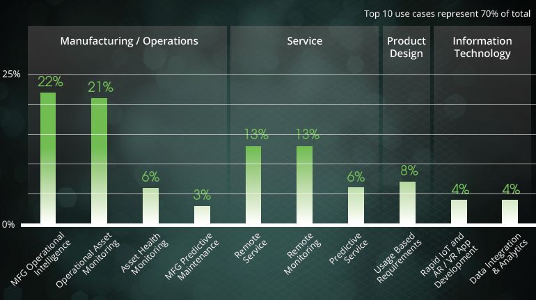 根據(jù)PTC的調(diào)查,IIoT的具體應(yīng)用場(chǎng)景包括制造/運(yùn)營(yíng)、服務(wù)、產(chǎn)品設(shè)計(jì)和IT等環(huán)節(jié),前10個(gè)應(yīng)用場(chǎng)景占到總數(shù)的70%。