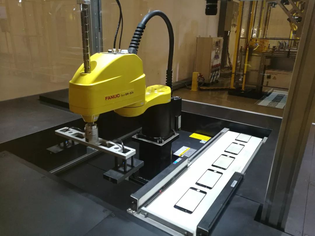 高速、緊湊型SCARA機器人SR-3iA對輸送線上的手機玻璃蓋板進(jìn)行定位抓取,可同時對多臺檢測機進(jìn)行上、下料作業(yè)。