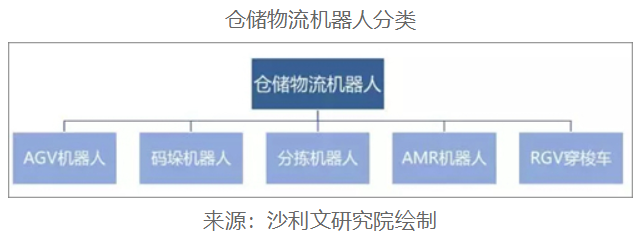 根據應用場景的不同,倉儲物流機器人可分為AGV機器人、碼垛機器人、分揀機器人、AMR機器人、RGV穿梭車五大類: