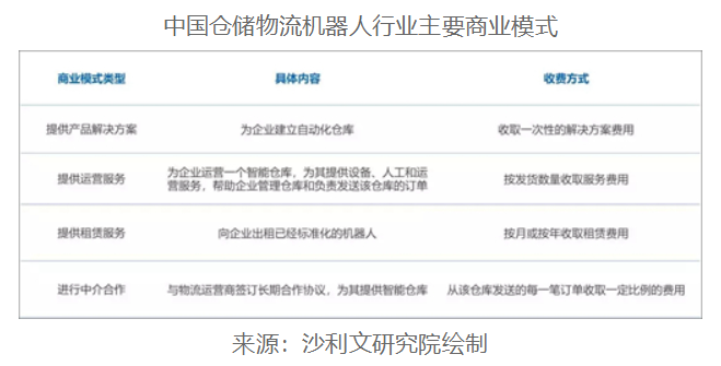 中國倉儲物流機器人行業(yè)的商業(yè)模式主要可分為四種,分別是提供產品解決方案、提供運營服務、提供租賃服務以及中介合作: