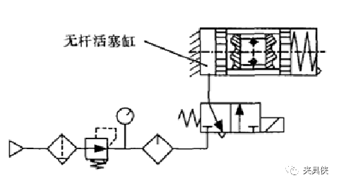 固定式無(wú)桿活塞缸的氣動(dòng)系統(tǒng)如下所示,該缸為單作用氣缸,反向靠彈簧力作用,由兩位三通電磁閥實(shí)現(xiàn)換向。