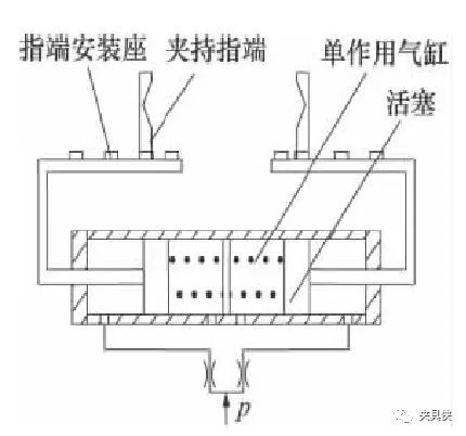 這種夾持機(jī)構(gòu)的指端通常安裝于配備有指端安裝座的直桿上,當(dāng)壓力氣體進(jìn)入單作用式雙氣缸的兩個(gè)有桿腔時(shí),會(huì)推動(dòng)活塞逐漸向中間移動(dòng),直至將工件夾緊。